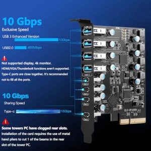 Sonnet Allegro 7-Port USB 3.2 Gen 1 Type A PCIe Card Connects Seven USB-A Devices: Adds seven USB-A 5Gbps ports (six external ports plus one internal port) to your computer, using only one PCIe card slot. Powered Ports: Supports USB 3 bus-powered hard drives, SSDs, and other devices with 5 Watts from each port. Protects Your Computer: Resettable device overcurrent...