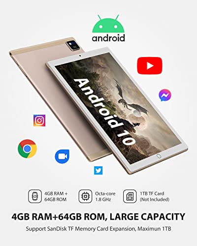 - 【HIGH PERFORMANCE ANDROID TABLET】: YUMKEM N10 tablet comes with the latest Android 10.0 OS, 4GB RAM, 64 GB ROM, the powerful and energy-saving 64 bits Octa-Core Processor 1.8GHz, enables quicker app launch, smoother videos and better overall performance. This tablet includes a micro SD card slot (can be added a 128 GB SD card Max, NOT included), no more worrying about storage space, making it easy to store ebooks, songs, pictures, videos, and download more games.