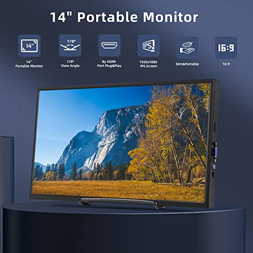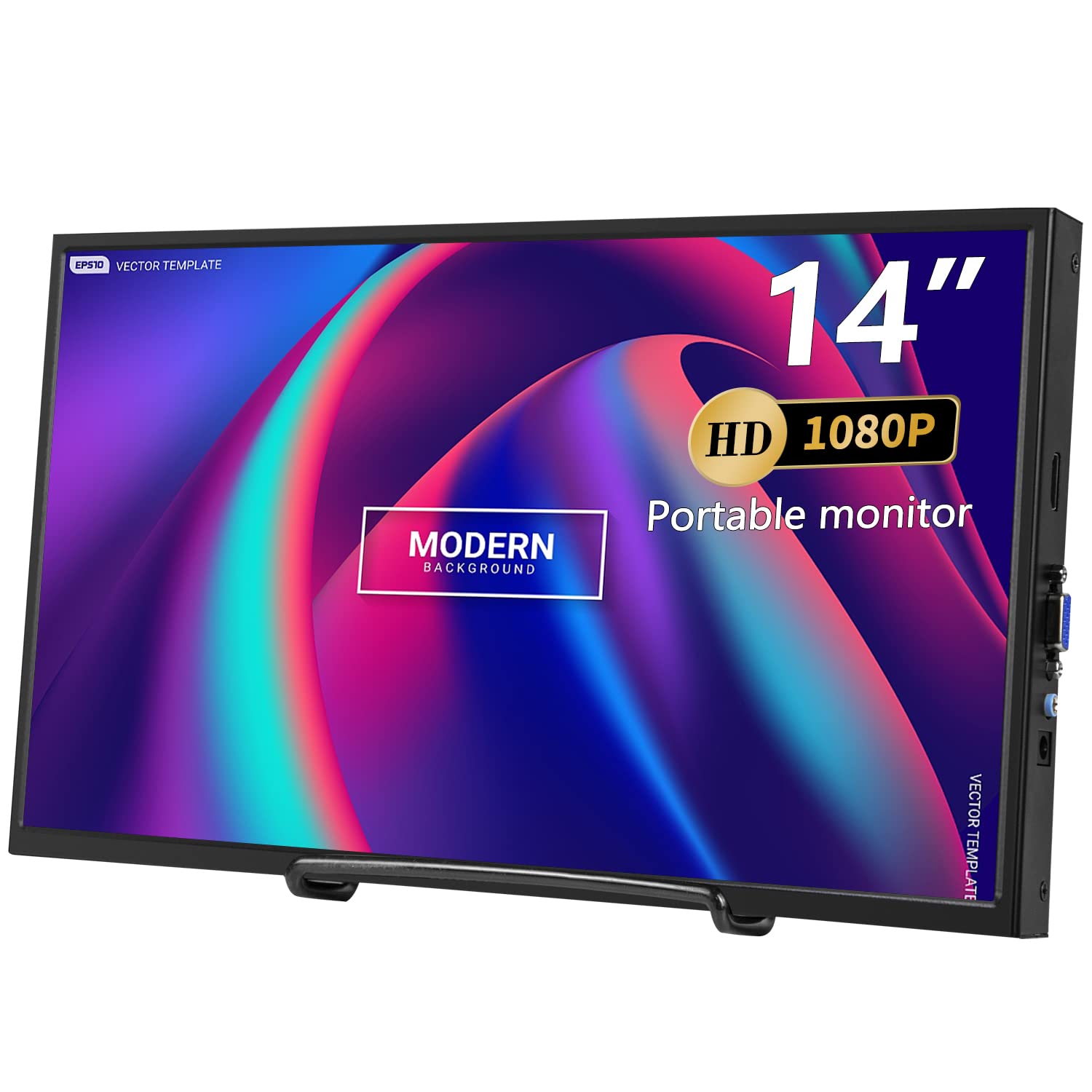 - 1. 14 inch portable External Monitor : Full HD 1920x1080P Resolution IPS Screen PC 16:9 or 4:3 Display ,5Ms Response time,60Hz Refresh rate,178° Full View,Restore the display to the most real display effect, reduce eye fatigue.