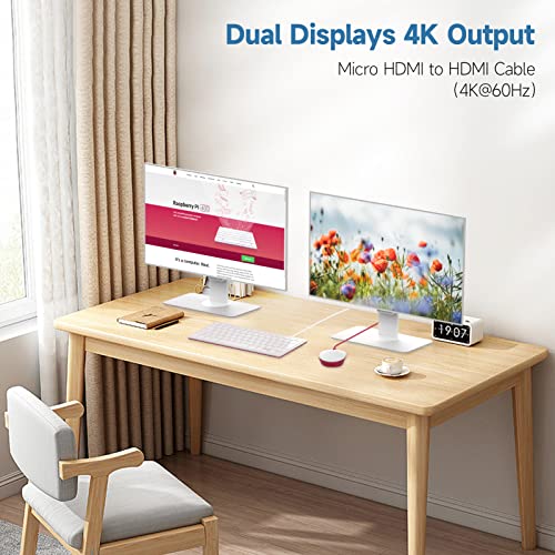 - 2 × USB 3.0 and 1 × USB 2.0 ports | Horizontal 40-pin GPIO header | 2 × micro HDMI ports (supports up to 4Kp60)