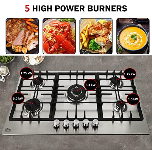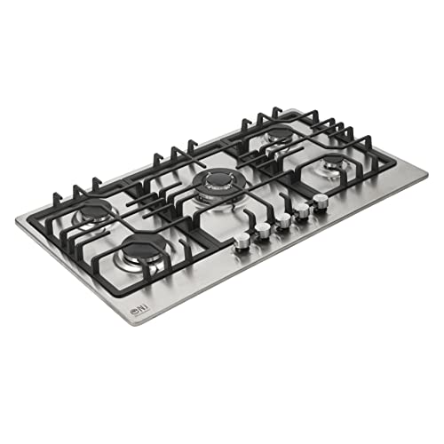 NJ-903S Gas Hob 5 Burner – 90cm Built-in Stainless Steel Cooktop NG/LPG Convertable Cooker with Cast Iron Supports & FFD