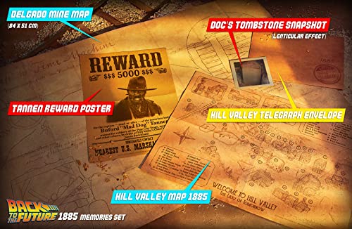 This box contains the memories that Marty collected during his time travels to 1955, 2015, 1885, and even to a parallel 1985, reminding him that all his adventures with Doc was real. THIS KIT INCLUDES: • Marty’s introduction Letter • OUTATIME “Distressed” License Plate 1 1885: o Hill Valley Telegraph Envelope o Doc’s Tombstone Snapshot (Disappearing effect) o Delgado Mine Map (84 cm x 51 cm) o Buford Tannen Reward Poster o Hill Valley Map 1885 1955 o Hill Valley High School Envelope o Lou’s Cafe Menu o Lorraine & George prom night portrait o Flux Capacitor Schematic Diagram o Enchantment under the sea Flyer o Lorraine wallet portrait o Hill Valley Map 1955 1985 o Twin Pines Mall Bag o McFly Family Photo (Lenticular disappearing effect) o Biff Tannen’s Pleasure Paradise Casino Red chip o “Save the Clock Tower” Ribboned badge o “Do not open until 1985” Marty’s letter o Marty’s “Slacker” Tardy Slip o “A Match Made in Space” Bookmarker o “Re-Elect Mayor Goldie Wilson” Badge o “Art in Revolution” Badge o “Save the Clock Tower” Flyer o “Dr. E. Brown Enterprises” Business card o Hill Valley Map 1985 2015 o Blast from the Past Bag o Cafe 80’s Coaster (Lenticular effect) o Double Sided Hoverboard Magazine Advert o Blast from the Past Receipt o Cafe 80’s Lenticular Placemat o “You’re fired” CUSCO Fax o Mr. Fusion sticker o 3D Hill Valley Map (3D depth & lenticular effect)
