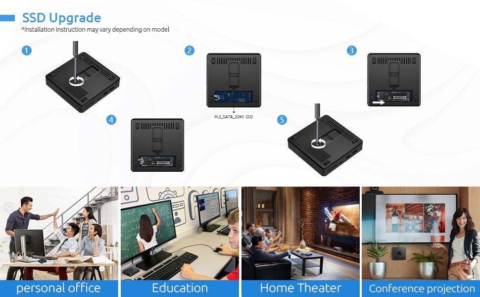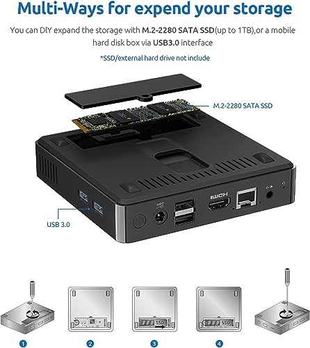- ⚡【Large Expandable Storage】This mini pc 6GB RAM+64GB eMMC mini computer supports DIY expand the additional storage with M.2_2280 SATA SSD (up to 1TB) and a mobile hard disk box via USB3.0 interface.