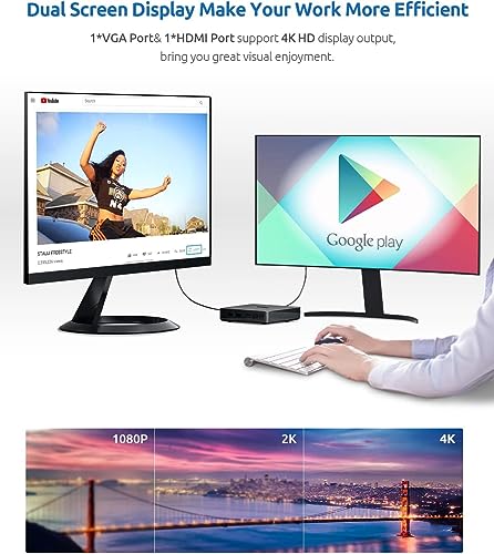 - ⚡【Dual Display & Intel HD graphic】The mini desktop computer supports HD and 4K (3840 x 2160) ultra-high-definition content, you can enjoy 4K Web surfing, video playback, watching TV, home theater, and enjoy the entertainment with your family. HDMI/VGA Port easily connecting two monitors, reduce waiting time, efficiency doubled.
