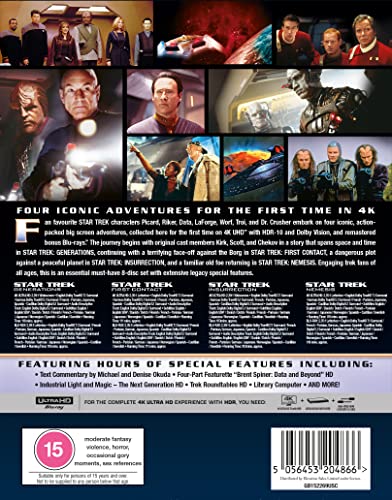 Fan favourite STAR TREK characters Picard, Riker, Data, LaForge, Worf, Troi, and Dr. Crusher embark on four iconic, actionpacked big screen adventures, collected here for the first time on 4K UHD™ with HDR-10 and Dolby Vision, and remastered bonus Blu-rays™. The journey begins with original cast members Kirk, Scott, and Chekov in a story that spans space and time in STAR TREK: GENERATIONS, continuing with a terrifying face-off against the Borg in STAR TREK: FIRST CONTACT, a dangerous plot against a peaceful planet in STAR TREK: INSURRECTION, and a familiar old foe returning in STAR TREK: NEMESIS. Engaging trek fans of