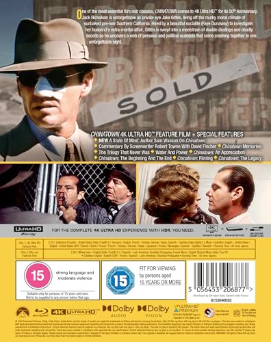 One of the most essential film noir classics, CHINATOWN comes to 4K Ultra HD™ for its 50th Anniversary. Jack Nicholson is unforgettable as private eye Jake Gittes, living off the murky moral climate of sunbaked pre-war Southern California. Hired by a beautiful socialite (Faye Dunaway) to investigate her husband’s extra-marital affair, Gittes is swept into a maelstrom of double dealings and deadly deceits as he uncovers a web of personal and political scandals that come crashing together in one unforgettable night.