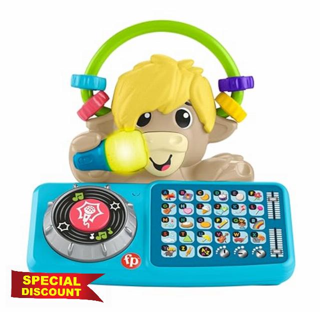 - Press the DJ table letter buttons & spin the turntable to activate fun music, sounds & phrases; light-up microphone syncs to the beat