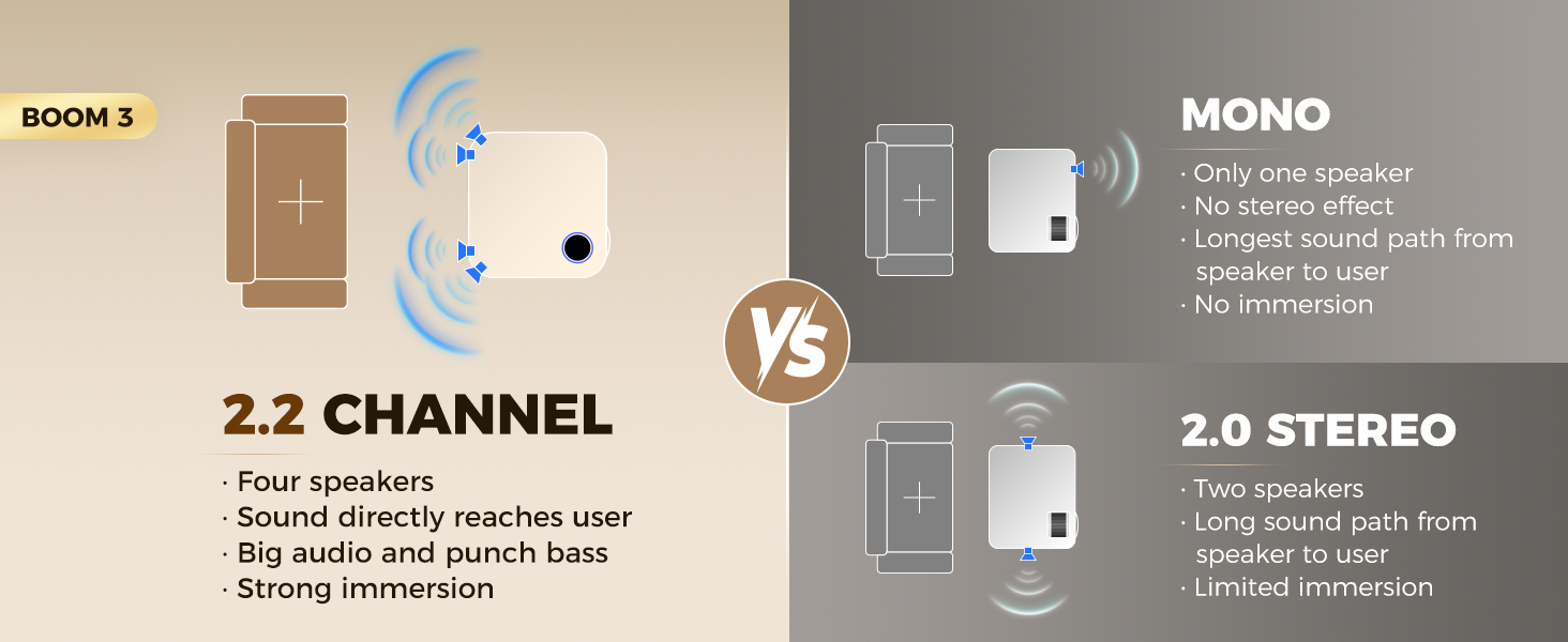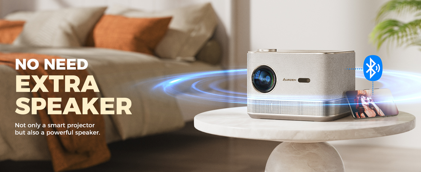 - Visible Advantage: Unique Projector with 4 Stereo Speakers : Different from all other projectors, this hd smart projector is built in with 4 stereo HiFi speakers. 95% projectors have only one speaker, rest 4.99% projectors have dual speakers. Aurzen Boom 3 is the only one with 4 speakers. We could enjoy true cinematic sound without need to connect with extra expensive speakers. Really worth more than you paid