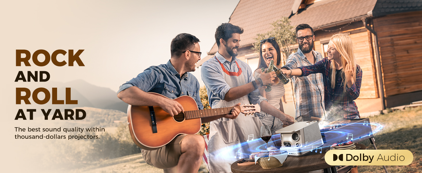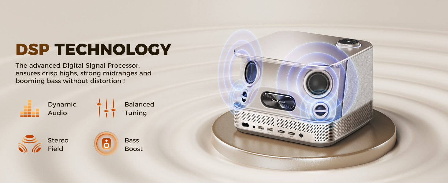 - First-class 36W Speakers, 3D DoIby Audio, Bidirectional Bluetooth 5.2 : Aurzen BOOM 3 portable projector is the revolutionary new-generation projector that elevates the stereo surround sound to an unparalleled level. With 36W powerful speakers and genuine DoIby audio to ensure crisp highs, strong midranges, booming bass, it stands out as the best in audio quality within thousand-pound projectors, really immersing yourself in a cinematic experience. It can be also used as a speaker