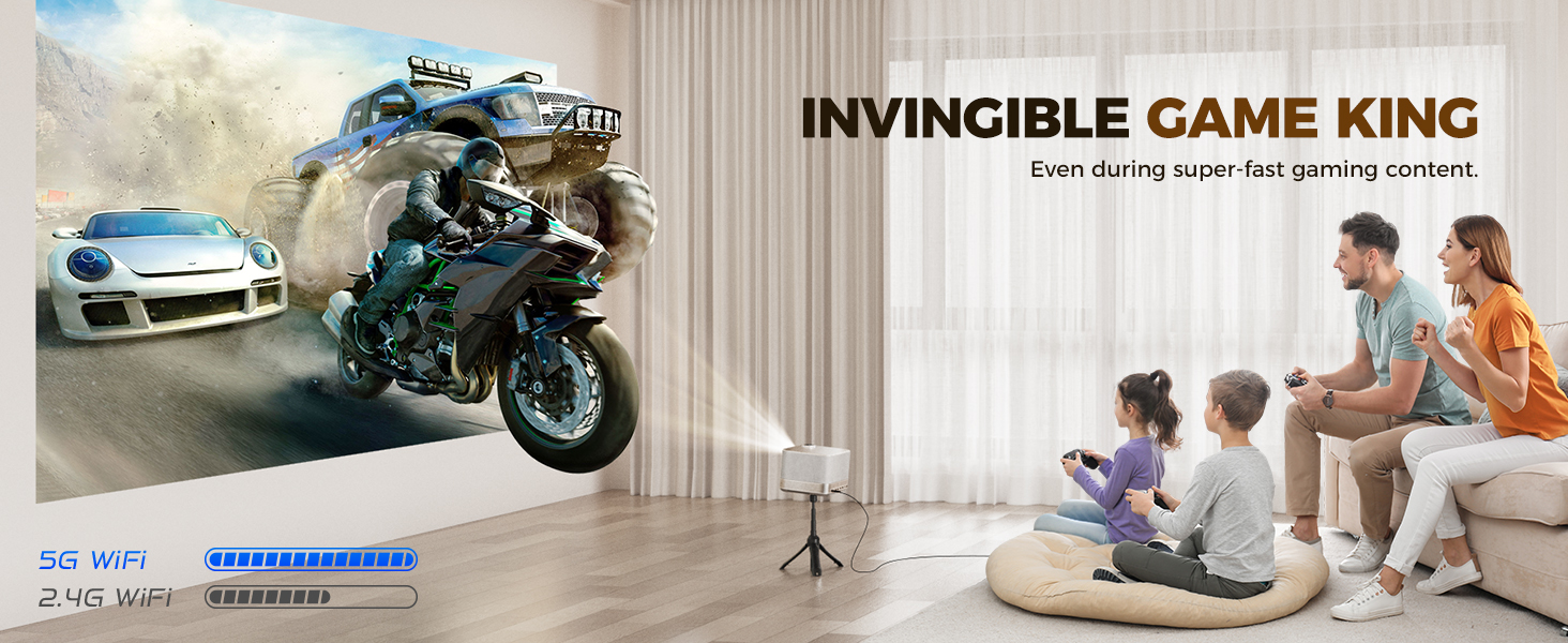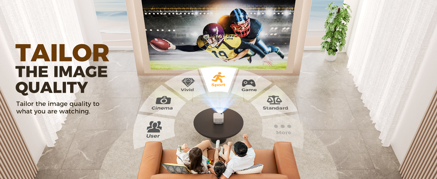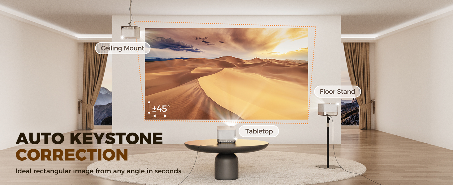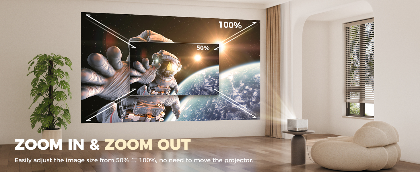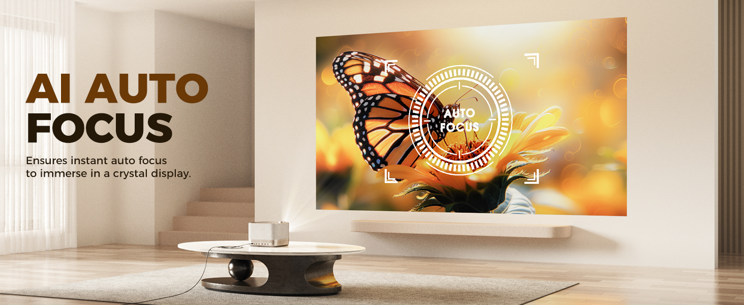 - AI Auto Focus, Auto Keystone Correction, 50%-100% Zoom : This home projector adopts the cutting-edge AI focus algorithm with 9 directional gyros, ensuring instant auto focus and ultra clear image at all times. The 6D auto Keystone correction achieves screen auto-adaptions with wide angle of 45° from six directions, whatever wall it is. And the zoom function allows you to easily adjust the image size from 50% to 100%, no need to move the tv projector