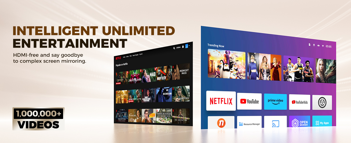 - Smart System, Officially-Licensed Apps : This 4k projector home cinema is equipped with advanced smart TV OS which supports 1,000,000+ videos. It’s pre-loaded with NetfIix-Officially-Licensed,Prime Video, and YouTube, which enable you to quickly launch your favorite movies or TV shows with just one click. Besides, the Open Browser and the APP STORE enable you to download your favorite apps. No need to connect with external TV sticks