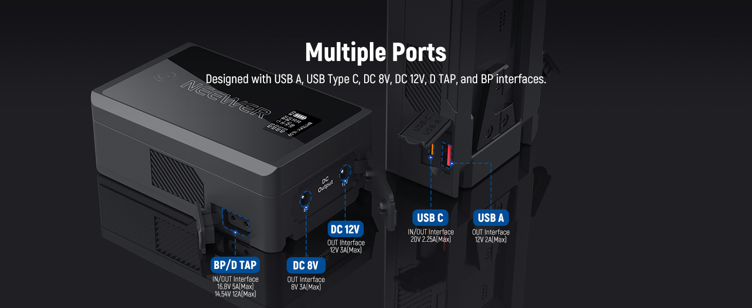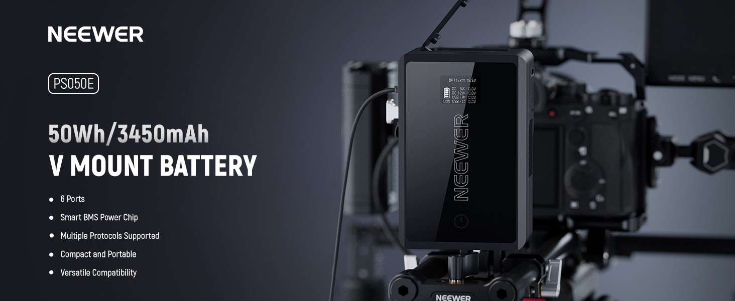 - 【Versatile with Multiple Ports】 This PS050E mini V mount battery has USB C, USB A, DC 8V, DC 12V, BP, and D Tap ports for devices like DSLR cameras and camcorders. It enables simultaneous discharging via the USB A and USB C interfaces. USB ports and DC ports are on different sides to prevent disconnection. Compatible with Canon Sony Nikon BMPCC 4K 6K Cinema Cameras, compatible with Atomos Ninja V monitor NEEWER F500, LED lights, PS005/PS006/PS007 V mount battery plates