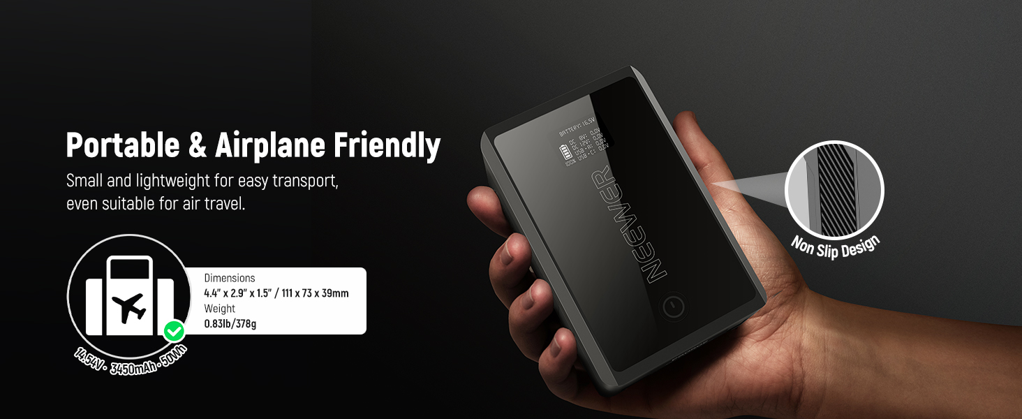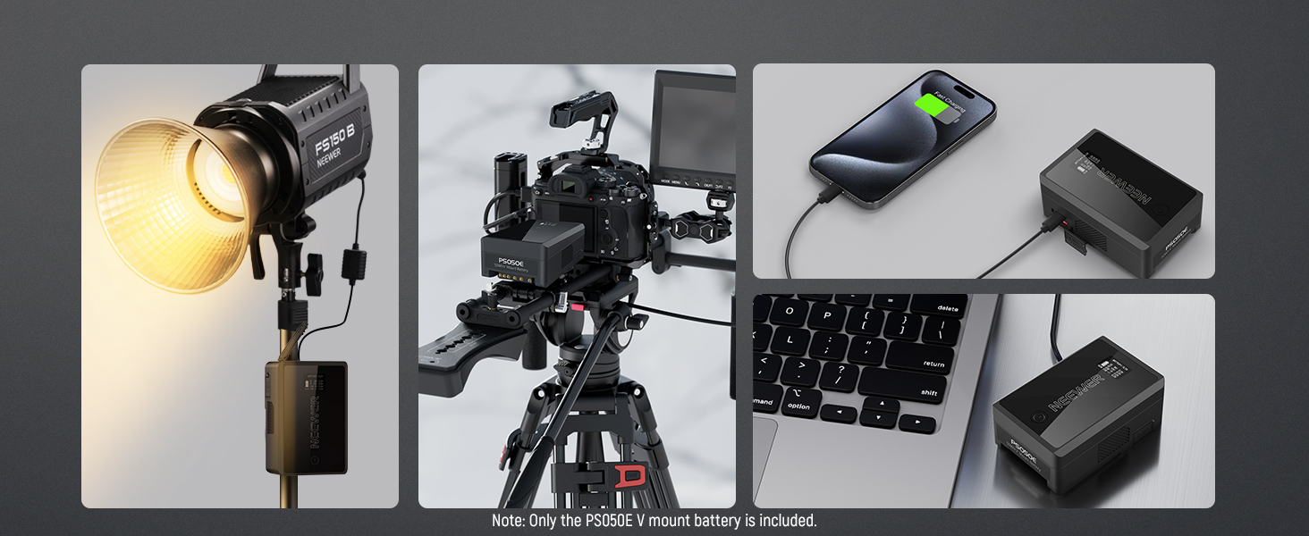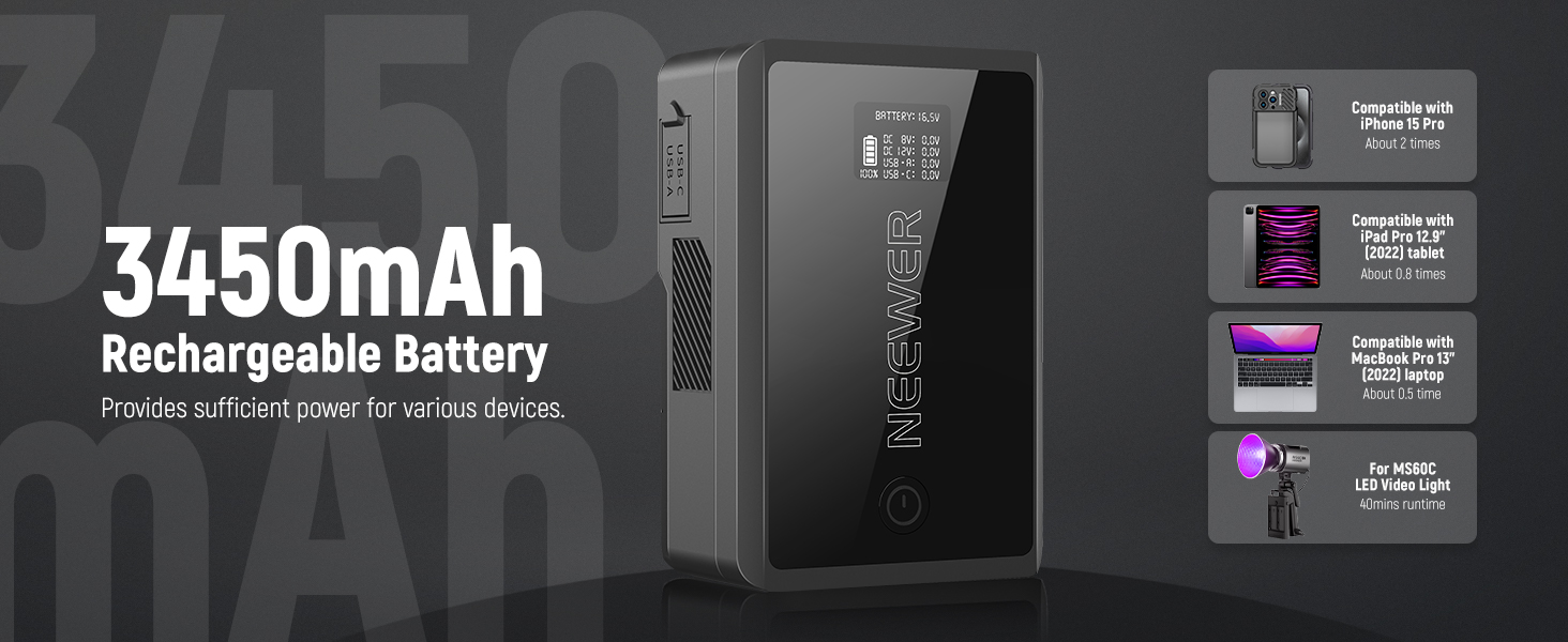 - 【Portable Design with Large Capacity】 Palm sized at 4.4" x 2.9" x 1.5" (111mm x 73mm x 39mm) and weighing just 12.7oz (360g), PS050E is airline friendly and never adds bulk for your travel. A 3450mAh large capacity (50Wh/14.54V) provides strong power for video shooting or filmmaking. Compatible with iPhone 15 Pro for 2 charges, compatible with iPad Pro 12.9" (2022) tablet for 0.8 charges,compatible with MacBook Pro 13" (2022) laptop for 0.5 charges and supports a 40mins power supply for MS60C LED Video Lightdone