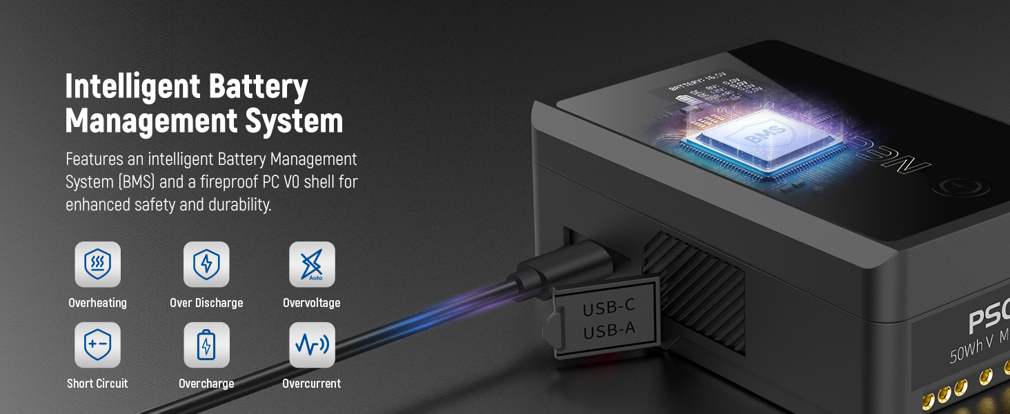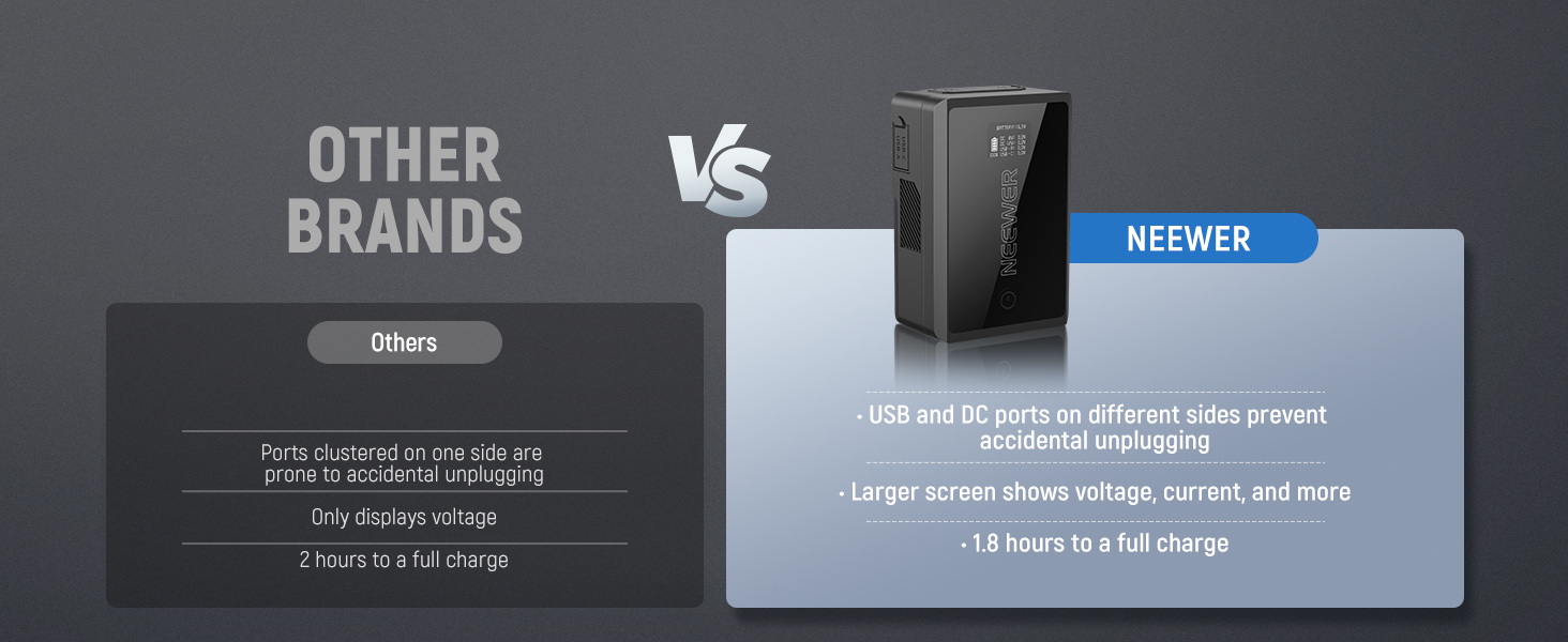 - 【Safe & Stable Voltage Output】 This V mount battery features an intelligent battery management system (BMS) that automatically protects against short circuits, over voltage, over current, overcharging, and over discharge, and even sends timely alerts in case of over power, over current, over voltage, overheating, and under power discharge. Features a fire resistant PC V0 shell for enhanced safety and durability