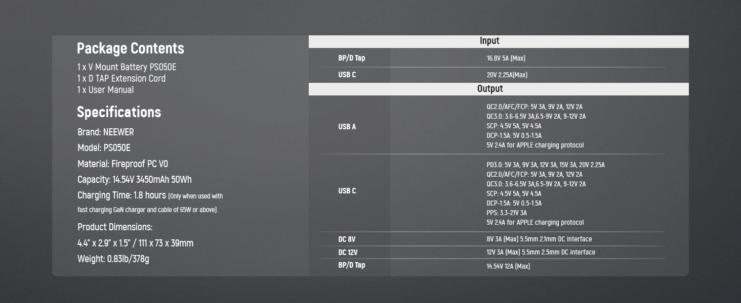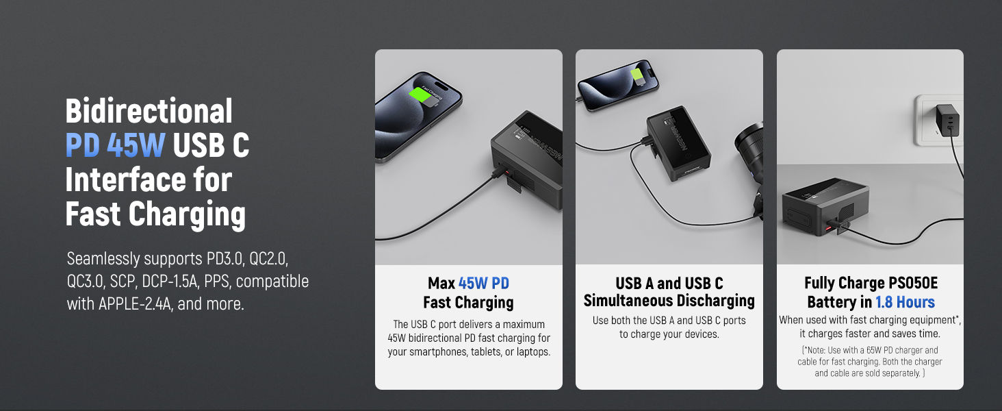 - 【Bidirectional 45W PD Fast Charging】 Seamlessly supports PD3.0, QC2.0, QC3.0, PPS, AFC, FCP, SCP, DCP-1.5A, compatible with APPLE-2.4A and more fast charging protocols. The USB C input & output port delivers a maximum of 45W two way PD fast charging for your smartphones, tablets, or laptops via a 45W PD charger and cable (both not included). The PS050E V mount battery can be fully charged in 2.5h using a PD 45W (and above) fast charging GaN charger set (not included)