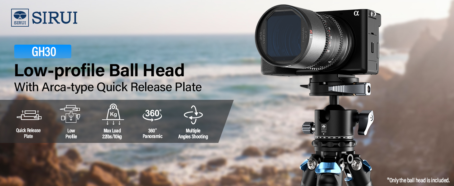 SIRUI Low Profile Tripod Head with Arca-type Quick Release Plate, 360°Panoramic Metal Camera Ball Head Mount with 1/4″ and 3/8″ Threaded Hole for Monopod, DSLR, Phone, Max Load 22lbs/10kg, GH3