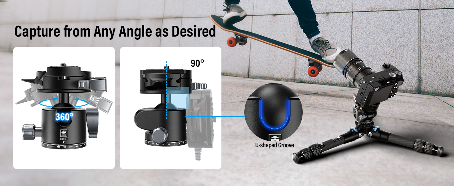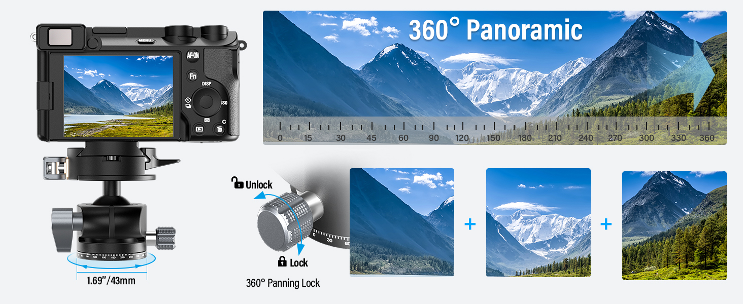 - 360°Panoramic & Multi-angle Shooting: The base of the SIRUI ball head is intricately laser-engraved with increments of ±0°-330° at 5° intervals, perfect for incremental panning, making it an ideal choice for multi-image panoramic photography. It offers -90°/+45° forward tilt and -50°/+50° lateral tilt for adjusting between horizontal and vertical shooting angles and more.