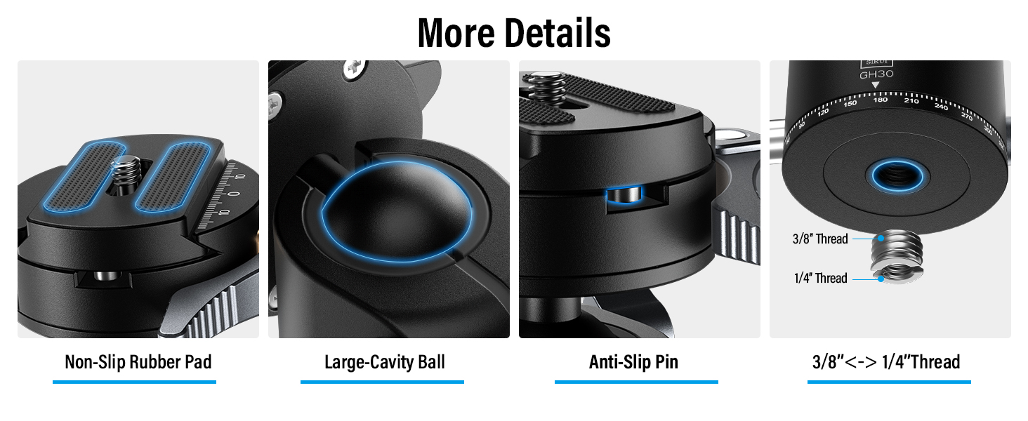 - High Stability: The SIRUI GH30 low-profile ball head design generates stronger locking force and higher stability. The screw knobs are positioned on the side of the ball head rather than the bottom, lowering the center of gravity by 15% and enhancing stability overall.