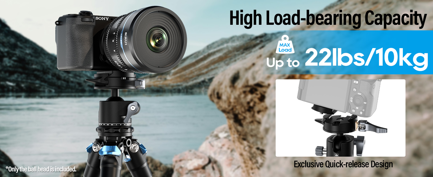 - High Load Capacity: The camera ball head mount is constructed from aluminum alloy, boasting a maximum load capacity of 22lbs/10kg, ensuring remarkable durability. It features rubber padding at the top to protect the camera from potential scratches.