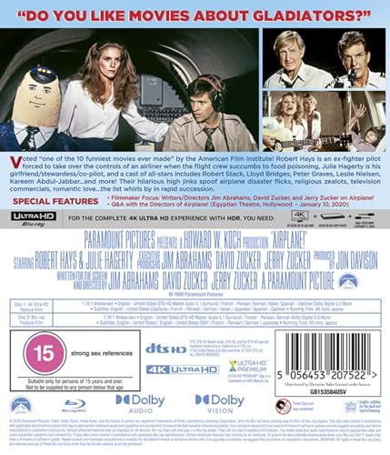 Voted “one of the 10 funniest movies ever made” by the American Film Institute! Robert Hays is an ex-fighter pilot forced to take over the controls of an airliner when the flight crew succumbs to food poisoning, Julie Hagerty is his girlfriend/stewardess/co-pilot, and a cast of all-stars includes Robert Stack, Lloyd Bridges, Peter Graves, Leslie Nielsen, Kareem Abdul-Jabbar.and more! Their hilarious high jinks spoof airplane disaster flicks, religious zealots, television commercials, romantic love.the list whirls by in rapid succession.