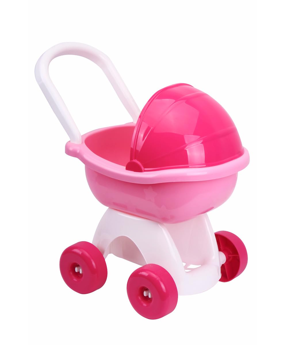 - The pink hood will add special charm to the design and extra comfort for the dolls inside. At the bottom of the toy pushchair, there is space for a bag with useful small items and toys. The large, reliable wheels ensure stability and good maneuverability of the baby doll stroller on various surfaces.
