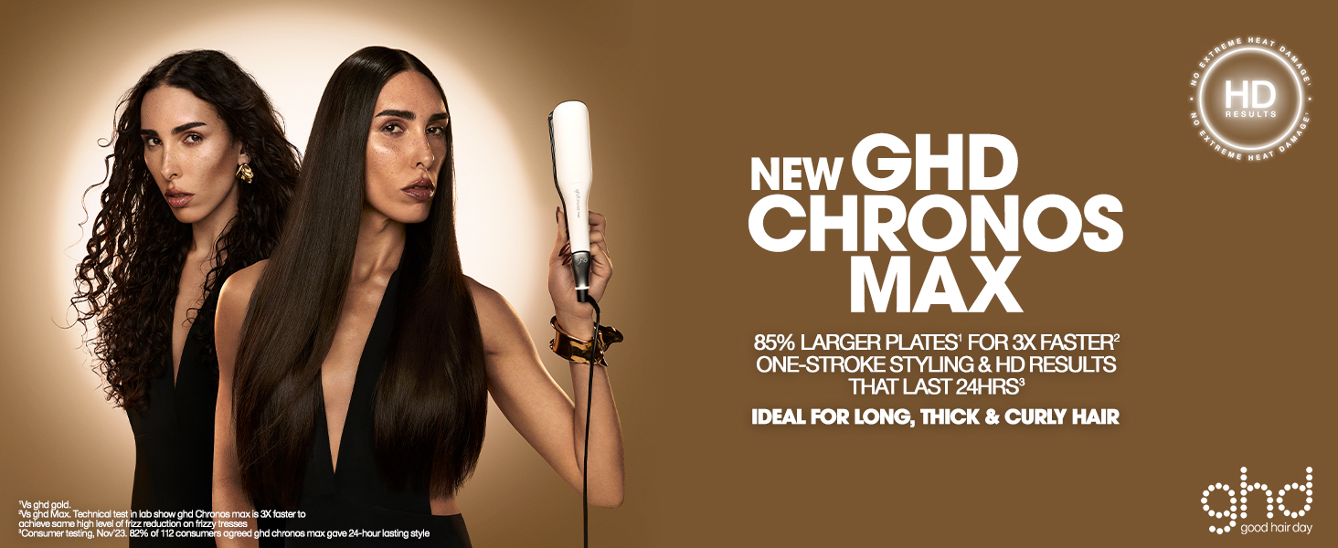 Do you have hair that is thick? long? curly? Are you looking for styling results that are FASTER? SHINIER? SMOOTHER? AND LASTS ALL DAY? Introducing ghd Chronos Max – Wide Plate Hair Straighteners for 3X faster₁ hair styling in just one stroke. ghd’s cutting-edge HD motion-responsive technology is now available in wide plate to transform long, thick and curly hair in one stroke for high-definition results that last 24hrs₂. With no extreme heat damage₅. 2X more responsive₈ ghd Chronos Max continuously adapts to styling movements guaranteeing unparalleled heat monitoring accuracy at the optimum temperature of 185°C – even on thick and curly 4C hair – for one stroke HD results: up to 90% more shine₃, 2.5X less frizz₄ and up to 2X more breakage protection₆. 85% larger close-edge plates₇ combined with the latest ghd technology allows you to take large sections with speed and get closer to the roots when styling for perfect root to tip results on long, thick and curly hair. Now you achieve up to 3X straighter hair₉ in one stroke for the ultimate professional finish, fast. High-definition styling just got maximised. ₁ Vs ghd Max. Technical test in lab show ghd Chronos max is 3X faster to achieve same high level of frizz reduction on frizzy tresses ₂ Consumer testing, Nov’23. 82% of 112 consumers agreed ghd chronos max gave 24-hour lasting style ₃ Technical test in a lab on brunette hair, measured vs. naturally dried hair ₄ Technical test in a lab on frizzy hair, vs naturally dried hair ₅ Extreme heat is any heat treatment causing fractional wet tensile strength reduction per cycle greater than 0.001, measured over at least 100 cycles on brown Caucasian hair (a “Strength Reduction”). Extreme heat damage is a Strength Reduction of more than 0.005 ₆ Vs competitor styler operating at 235oC ₇ Vs ghd gold ₈ Vs ghd platinum+ with ultra-zone technology ₉ Technical test in a lab on wavy hair, vs naturally dried hair