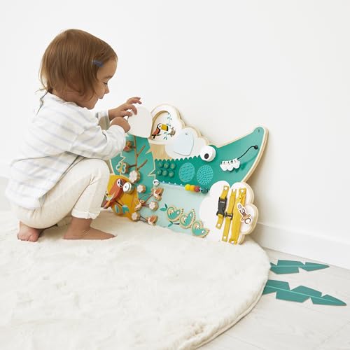 - BUSY BOARD CROCO: Dive into the jungle with Croco! Hanging busy board with 14 activities: maze, gears, straps, bell, mirror, lock, textures and more. Stimulates curiosity & motor skills from 18 months. FSC wood, fun guaranteed!