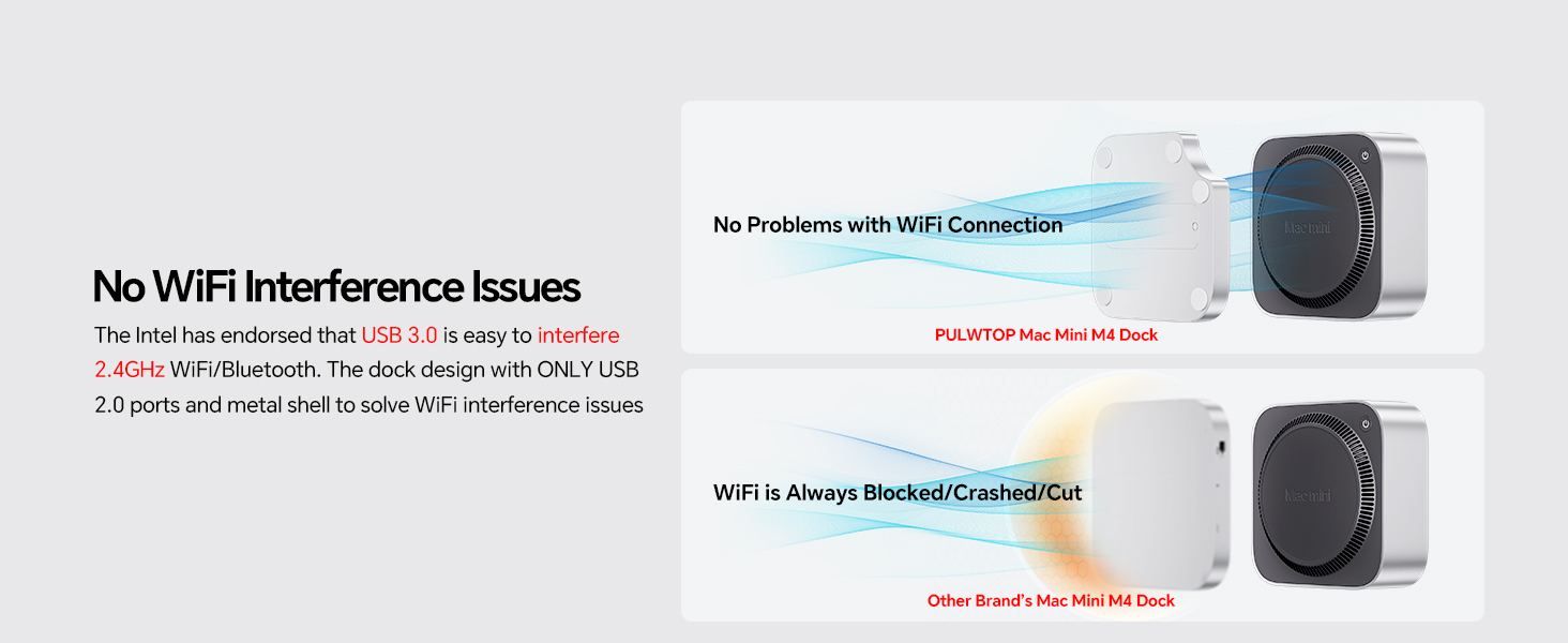USB-A PORTS COMPATIBILITY – The mac mini m4 dock boasts 3 x USB A 2.0 ports, which do not interfere with the Mac Mini's WIFI and Bluetooth signals and allows you access mouse, keyboard, and other USB A peripherals effortlessly and no-delay, while the SD/ Micro SD Card readers and 3.5mm Audio/Mic jack to enhance your mac mini m4 dock experience. *NOTE: ALL of the USB A ports ONLY support data transfer, DO NOT support charging