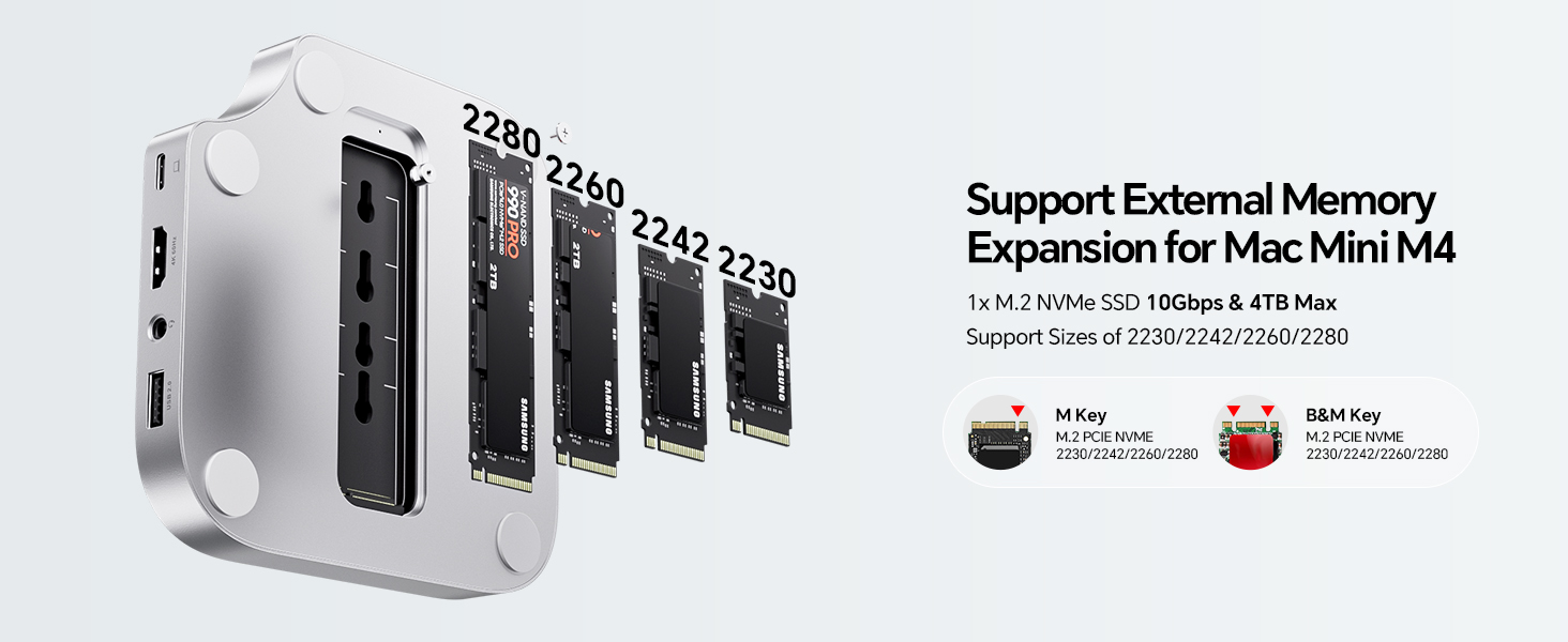 SUPPORTS M.2 SSD EXPANSION – The Mac Mini M4 2024 hub stand supports up to 4TB/10Gbps M.2 PCIe NVMe external hard drive expansion, perfect for the mac mini m4 users who needing additional storage without compromising speed or efficiency. Support PCIe M.2 SSDs in size of 2242/2260/2280. NOTE: 1). SSD is NOT included; 2). DOES NOT support SATA SSDs; 3) Please format your new SSD in exFat format before use
