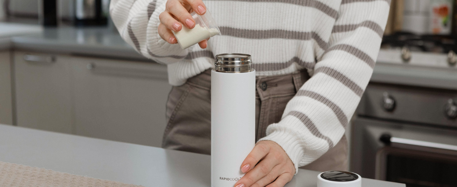 Once you have added the milk formula, give the RapidCool a shake, tipping it upside down to ensure the water reaches the thermometer in the lid of the RapidCool.