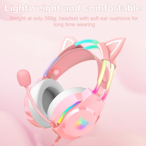 ONITOON Gaming Headset with Cat Ears, RGB Backlight Headphones for PC/PS4/PS5/XBOX/Switch with Noise Cancelling Mic- Virtual 7.1 Surround Sound, Lightweight Design & Auto-Adjust Headband, Pink
