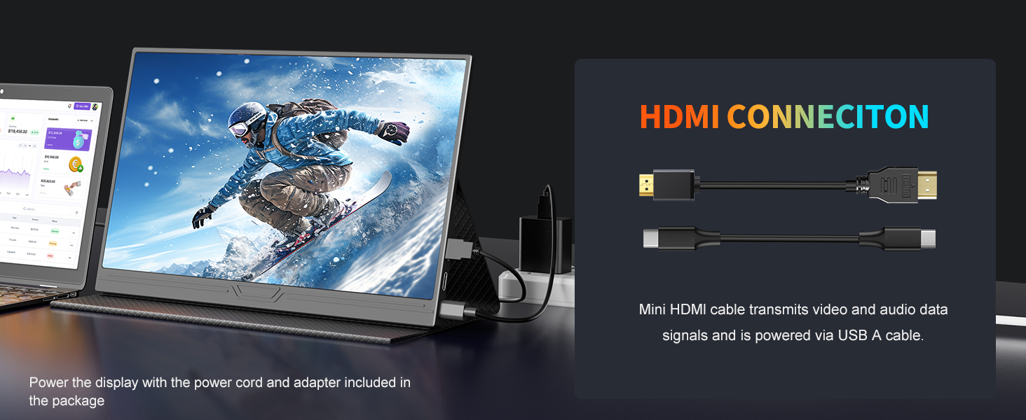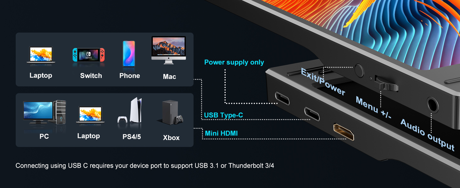 - PLUG & PLAY: If your device port supports Thunderbolts 3/4 or USB 3.1Type-C/3.2, you can use the included USB-C cable to connect the monitor via a single cable with no need to download an APP (it is recommended to equip the monitor with a separate power supply to save the settings and keep the power on during use).