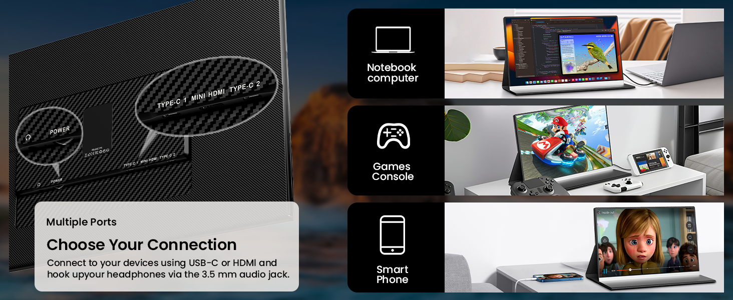 - Ultra-Lightweight & Portable Design: Weighing only 1.4lbs and featuring a 0.3-inch ultra-slim IPS panel, this portable monitor is engineered for mobility. Perfect for travel, remote work, or on-the-go collaboration, it effortlessly fits into any lifestyle.