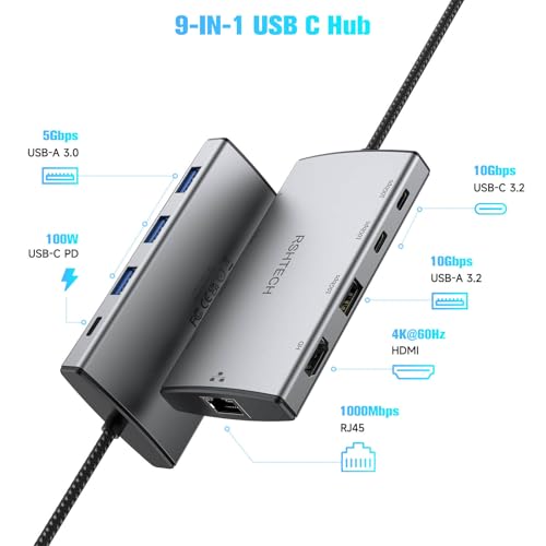 RSHTECH USB-C Hub 10Gbps, 9-in-1 USB C Multiport Adapter with 1Gbps Ethernet Adapter, 4K HDMI, 3x USB3.2 Ports, 3x USB3.0 and 100W PD, USBC Dock for Laptops with Type-C/Thunderbolt Po