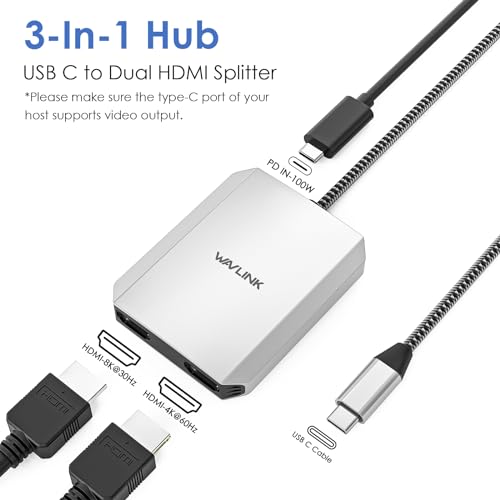 USB C to Dual HDMI Adapter, WAVLINK Dual 4K@60hz HDMI Adapter with 100W Power Delivery for Dell XPS, HP, Lenovo, Thunderbolt 3/4 Laptops, windows systerm Laptops