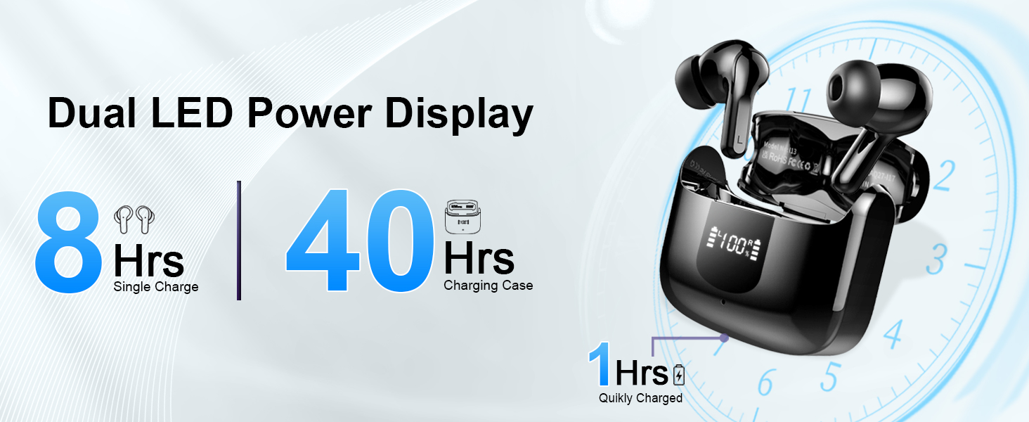 - Real-Time Dual LED Display and 40Hrs Playtime: The earphones wireless bluetooth can last 6-8 hours playtime from a single charge and provides total 40 hours playtime with charging case. Dual LED battery display design, You can precisely control the power status of the charging box and each ear buds wireless earbuds when in charging. With UCB-C quick charge, you can play music for 1.5 hour after charging 10 minutes.
