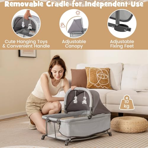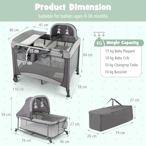 5 in 1 Baby Travel Cot, Foldable Infant Crib with Mattress, Diaper Changer, Storage Pockets, Hanging Toys, Lockable Wheels & Carry Bag, Portable Bedside Sleeper for Newborn (Grey)