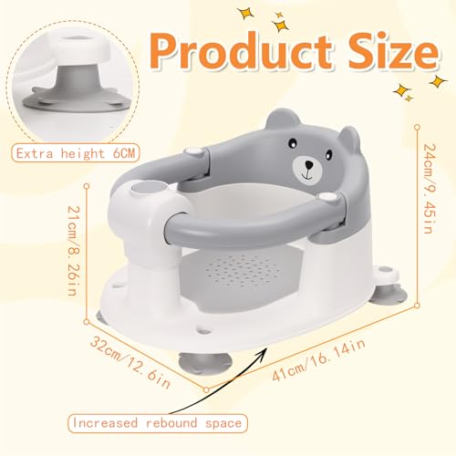 - 【Strong suction cup】The non-slip baby bathing chair has four non-slip suction cups that can fix the baby and prevent the baby from tipping over. The raised design on the side of the suction cup allows the bathing chair to be easily pulled up after use. And this bath seat is 6 cm higher from the ground, which increases the rebound space and allows the baby to sit for a long time without getting tired