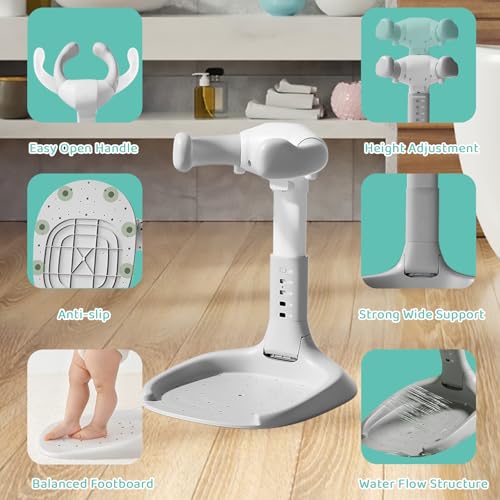 Baby Bath Stand, Baby Shower Standing Support with Adjustable Height and Armrest, Portable Bath Helper with Anti-Skip Base for Infants 8-36 Months