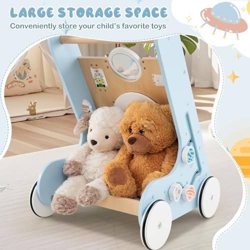 COSTWAY Wooden Baby Walker, 8 in 1 Toddler Push Along Toy with Activity Center, Mirror, Boys Girls Sit to Stand Learning Walkers for 1+ Year Old (Blue)