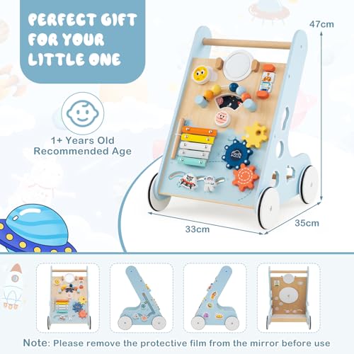 - 【8-in-1 Activity Center】Featuring a captivating 8-in-1 activity center, this walker toy includes a rotatable acrylic mirror, universe, flippable blocks, a xylophone with a mallet, a roller, a tracking game, rotating gears and versatile shape sorters, engaging your child’s senses and enhance him/her learning experience.