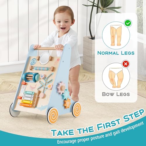 - 【8-in-1 Activity Center】Featuring a captivating 8-in-1 activity center, this walker toy includes an acrylic mirror, beads, a rolling drum, flippable blocks, a xylophone with a mallet, a tracking game, rotating gears and versatile shape sorters, engaging your child’s senses and enhance him/her learning experience.