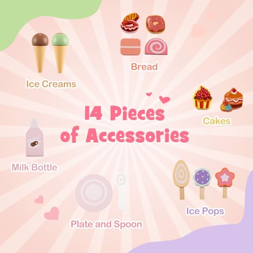 - 【Simulated Ice Cream Cart】Designed for imaginative role-play, this cute walking toy comes with 14 delightful accessories, including ice creams, ice pops, cakes, bread, a milk bottle, plate and spoon. Kids can engage in interactive play as shopkeepers and customers.