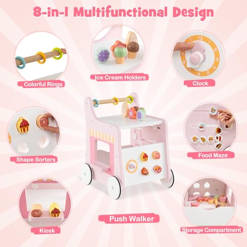 COSTWAY Wooden Baby Walker, 8 in 1 Toddler Push and Pull Learning Activity Center with Teaching Clock, Shape Matching, Accessories, Pretend Ice Cream Cart Toy for 12 Months +