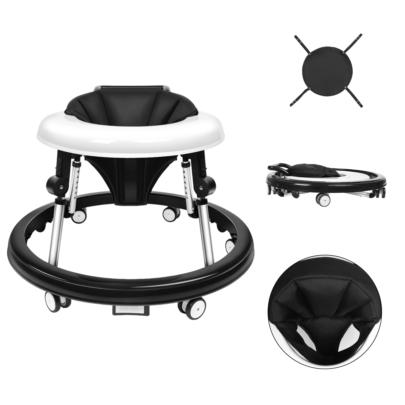 Foldable Baby Walker 9-Level Adjust No Assembly for Home & Travel: pre-assembled ready to use unfold adjust height grows with baby removable BPA-free tray works as high chair anti-tip base safe on carpets hardwood lightweight fold fits car trunks strollers 360° wheels glide smoothly indoors outdoors machine-washable seat pad sturdy frame meets safety standards