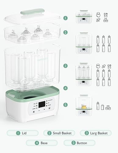- Advanced Design for Safety and Convenience – Designed with a fully automatic operation and LED countdown display, the Momcozy bottle sterilizer is easy to use and ensures precise and safe sterilization. Its spacious design allows for the sterilization of up to 8 bottles at once.