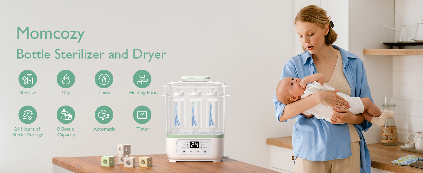 Momcozy Bottle Sterilizer and Dryer is designed to meet the needs of busy parents like you. your all-in-one solution for keeping your baby's bottles and breast pump accessories clean and safe.