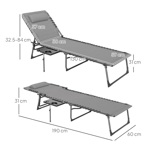 Lay the day away, your way with this Outsunny sun lounger. The back can be set to five different angles to a position you want. Powder coated steel frames are strong structures to support you as you relax. The fabric seat with double elastic cords holds you comfortably on the sunbathing chair, complete with a pillow. A side tray table and side pocket enhance the lounging convenience. This foldable sun lounger with carry handles makes it easy to soak up the sun or chill in the shade.