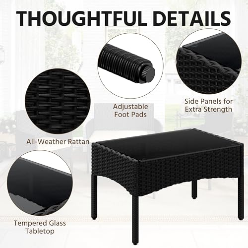 Yaheetech 4 Pieces Outdoor Patio Conversation Set, PE Rattan Wicker Sofa Set with Soft Cushion and Tempered Glass Table for Yard, Poolside, Garden (Black/Gray)