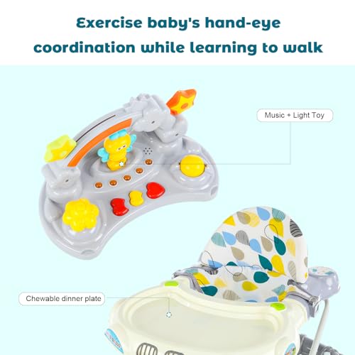 4 in 1 Foldable Baby Walker, Anti-Rollover Activity Baby Walker – Rocking Chair, Music Dining Seat and Push Walker with Brake, Adjustable Height and Space, Ages 6-18 Months